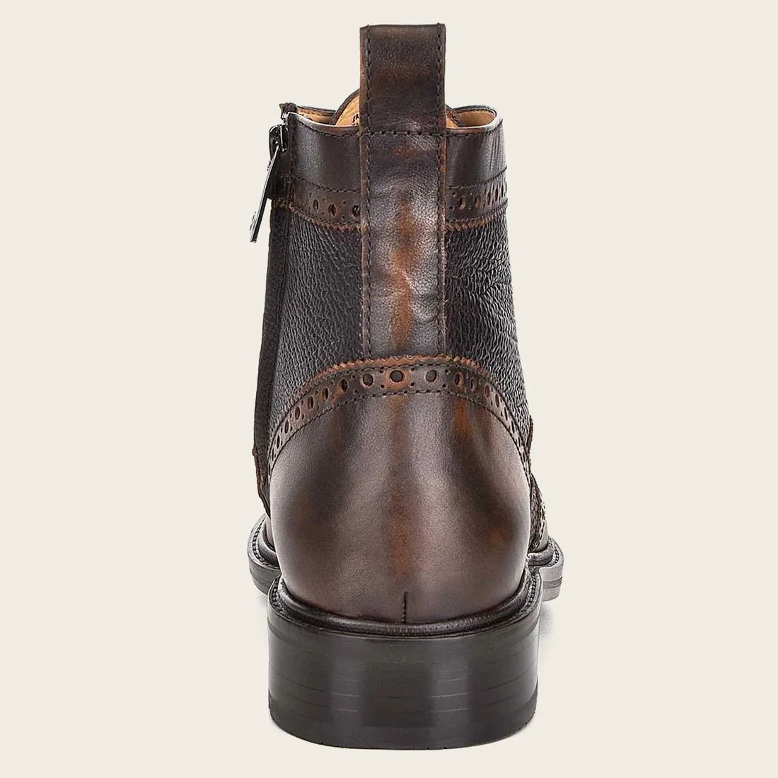 Our men's boot in high-quality bovine leather boasts a stylish design with contrasting textures and broguing details on the front and sides. With an inner zipper and laces for easy adjustability, this boot provides a comfortable fit. The leather sole with TPU injection also ensures superior traction when walking. Choose a boot that offers both style and function for any occasion.